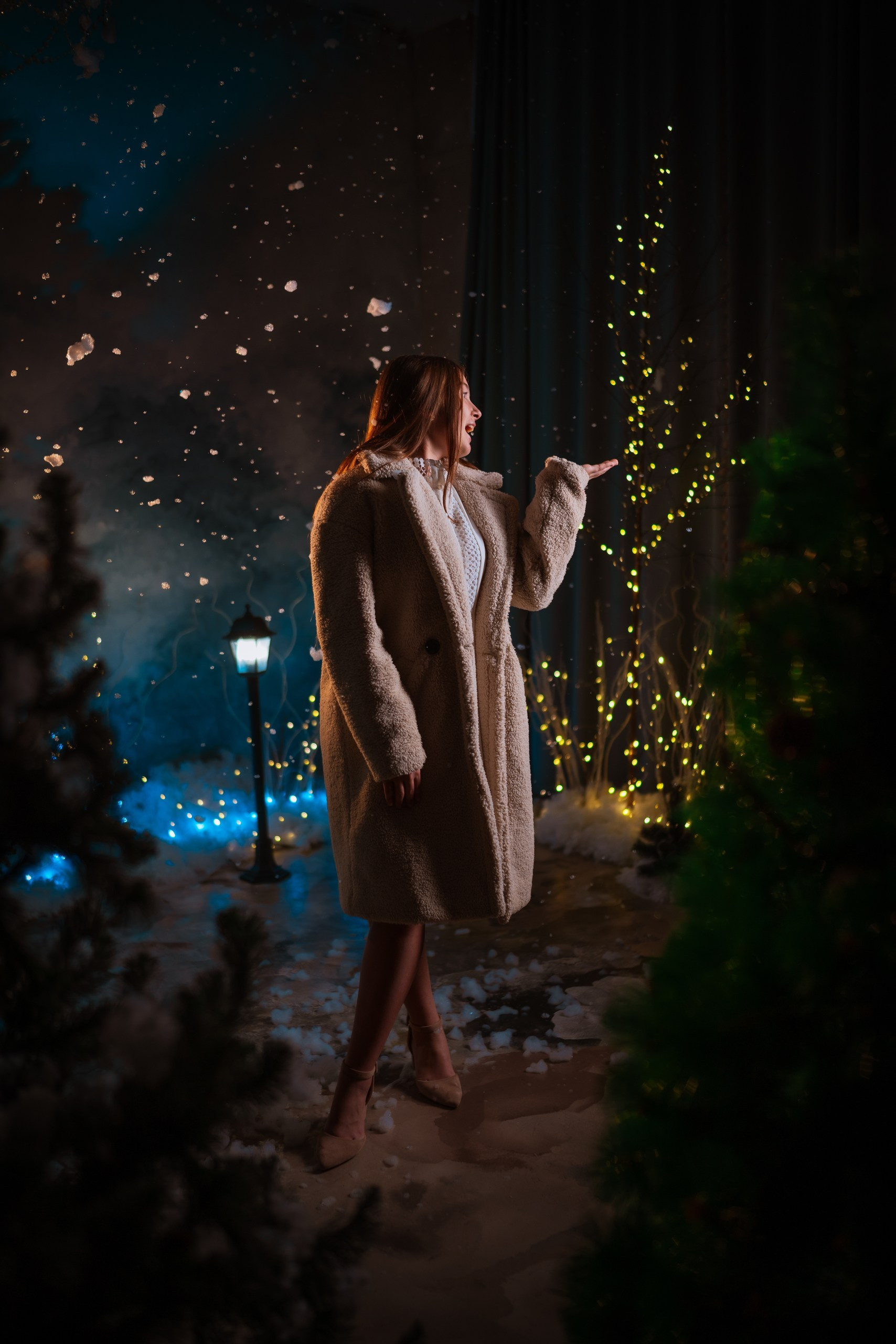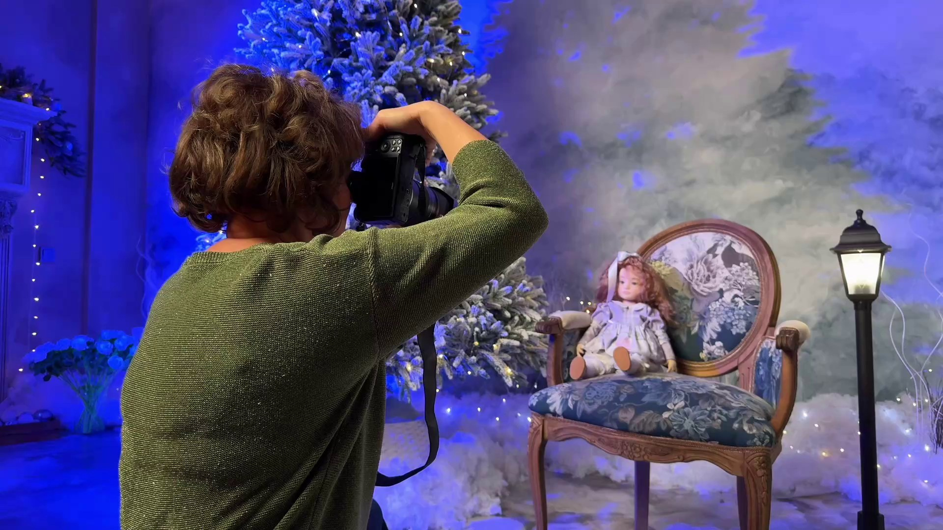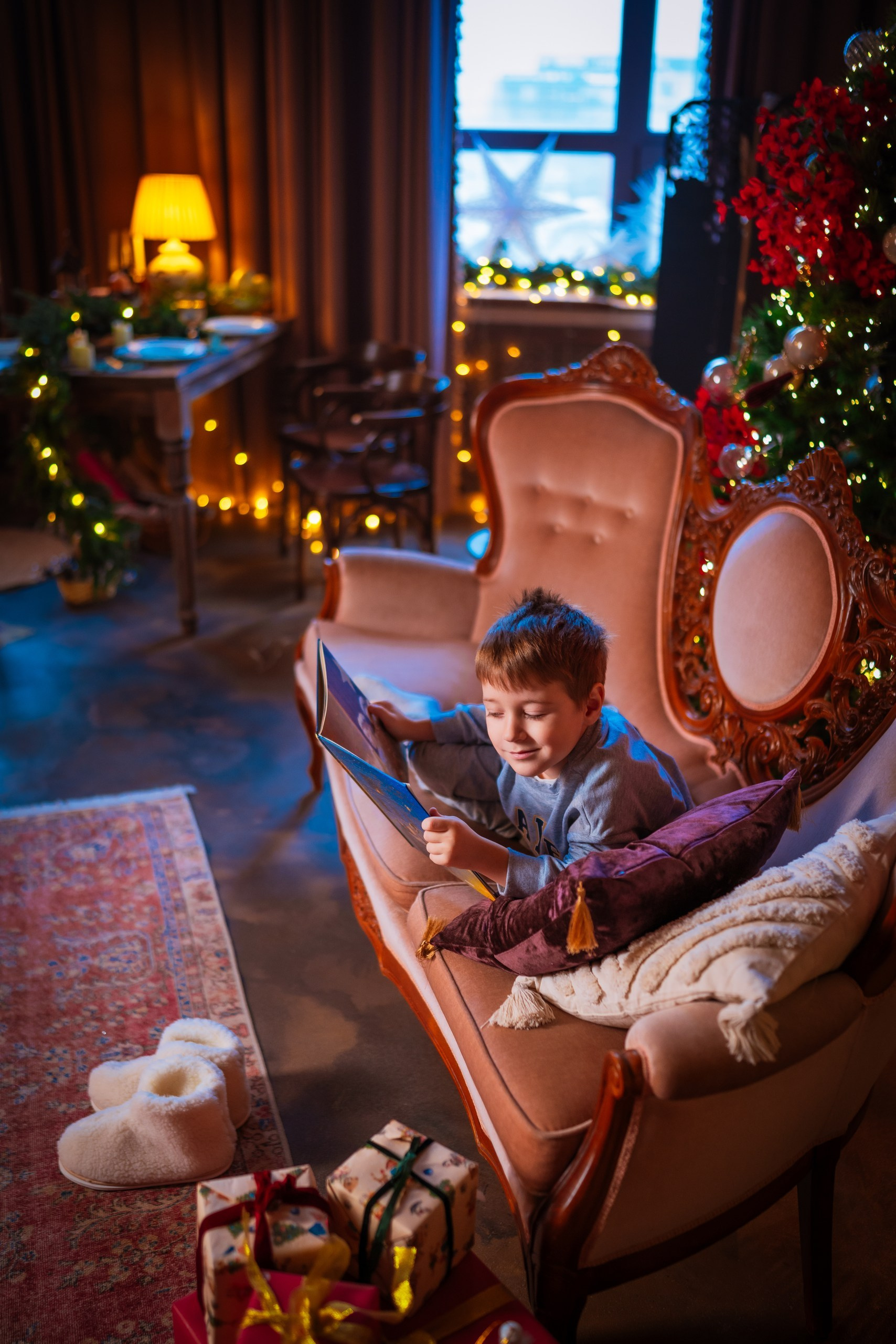 Ёлки с множеством огоньков и винтажный диван. Место для уютных семейных кадров. Звезда с гирлядной переносная, может быть размещена в этой зоне.