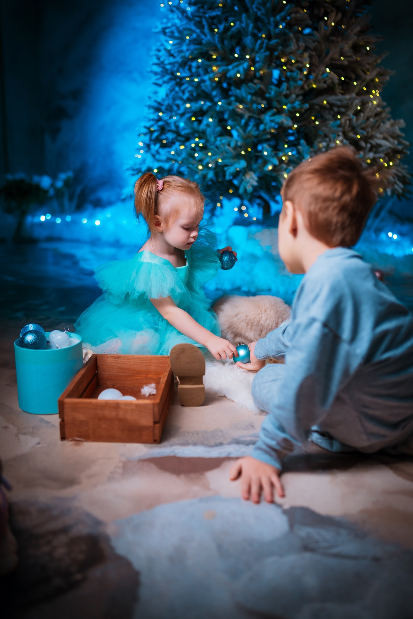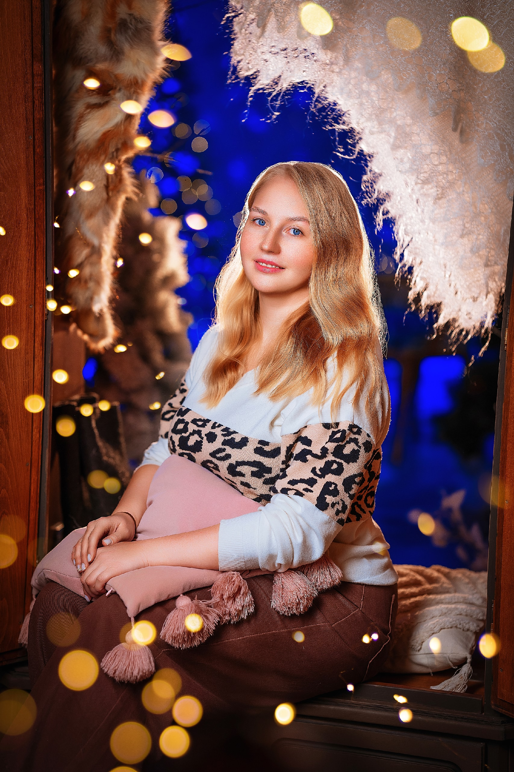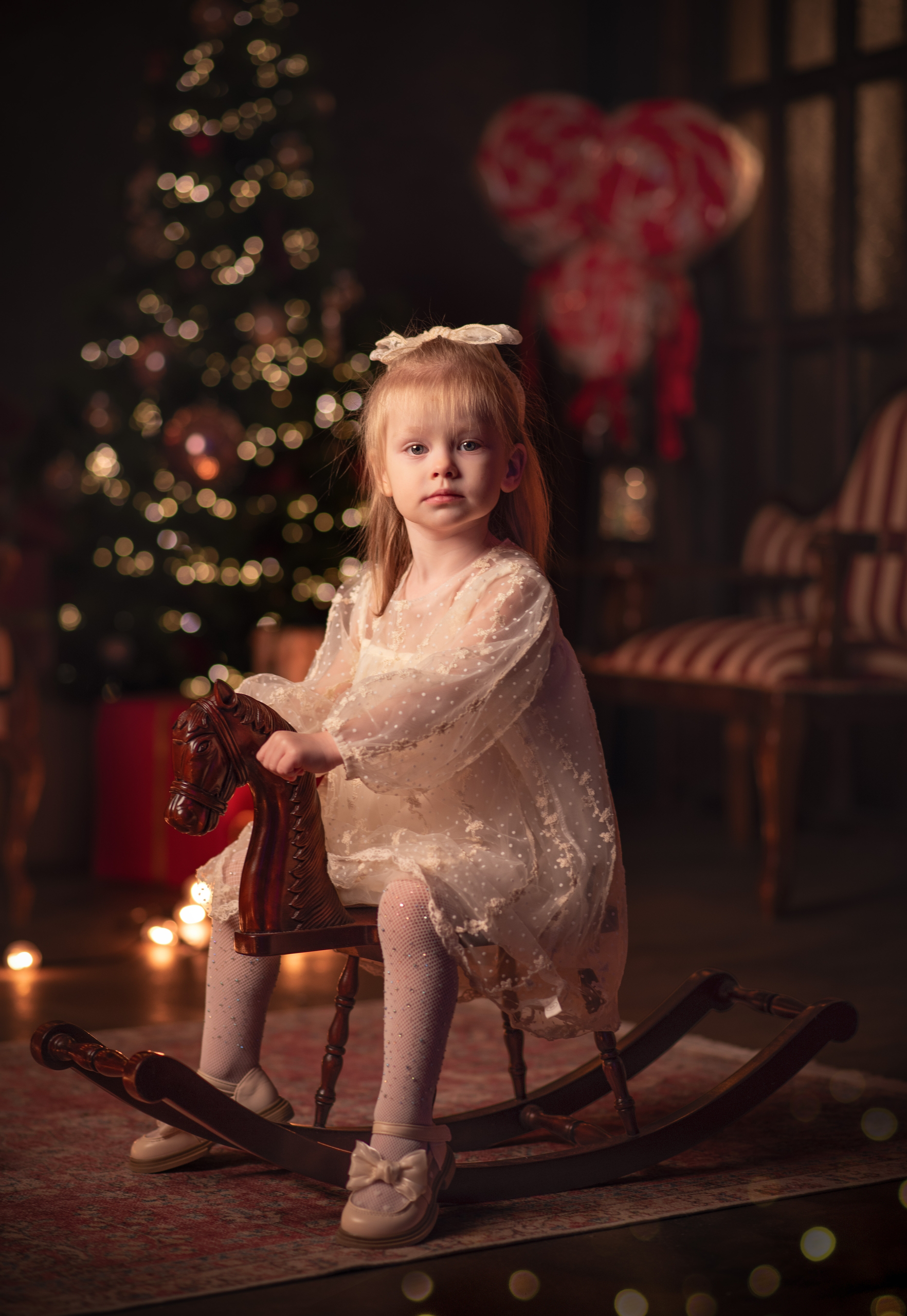 Ёлки с множеством огоньков и винтажный диван. Место для уютных семейных кадров. Звезда с гирлядной переносная, может быть размещена в этой зоне.
