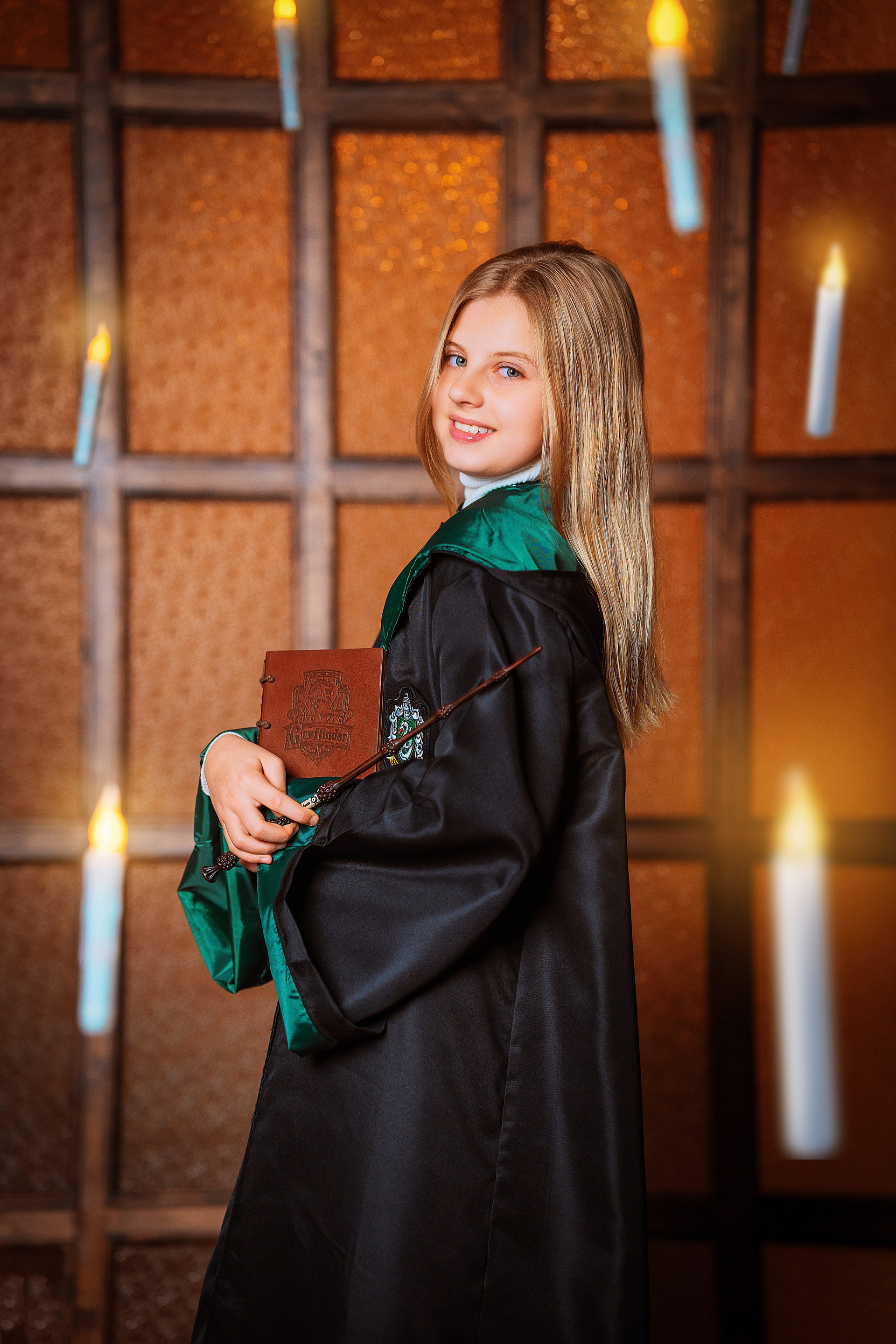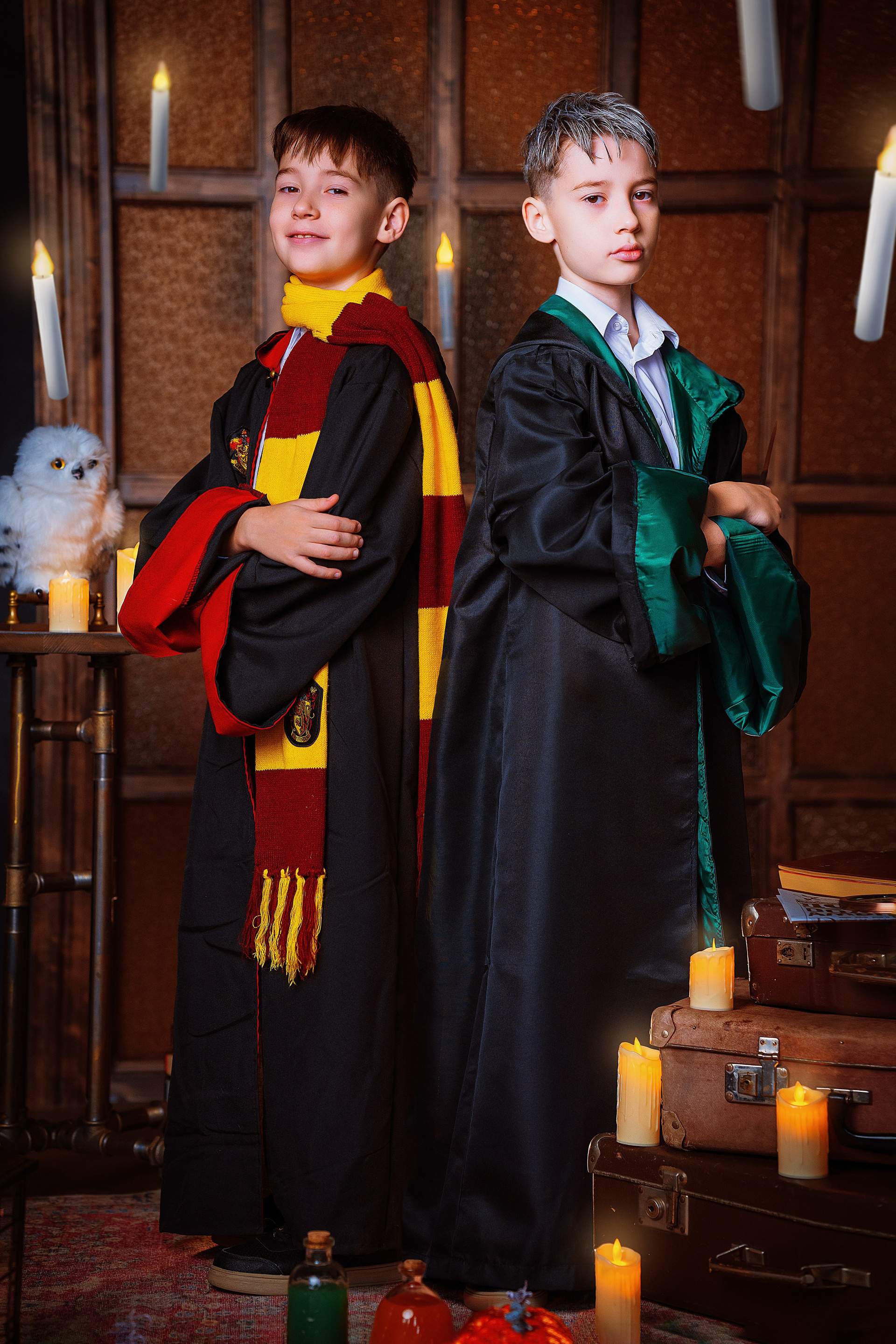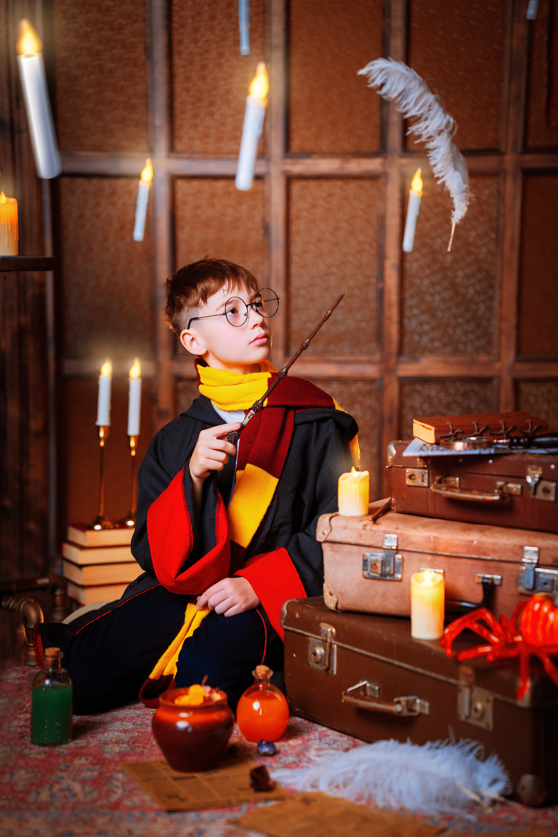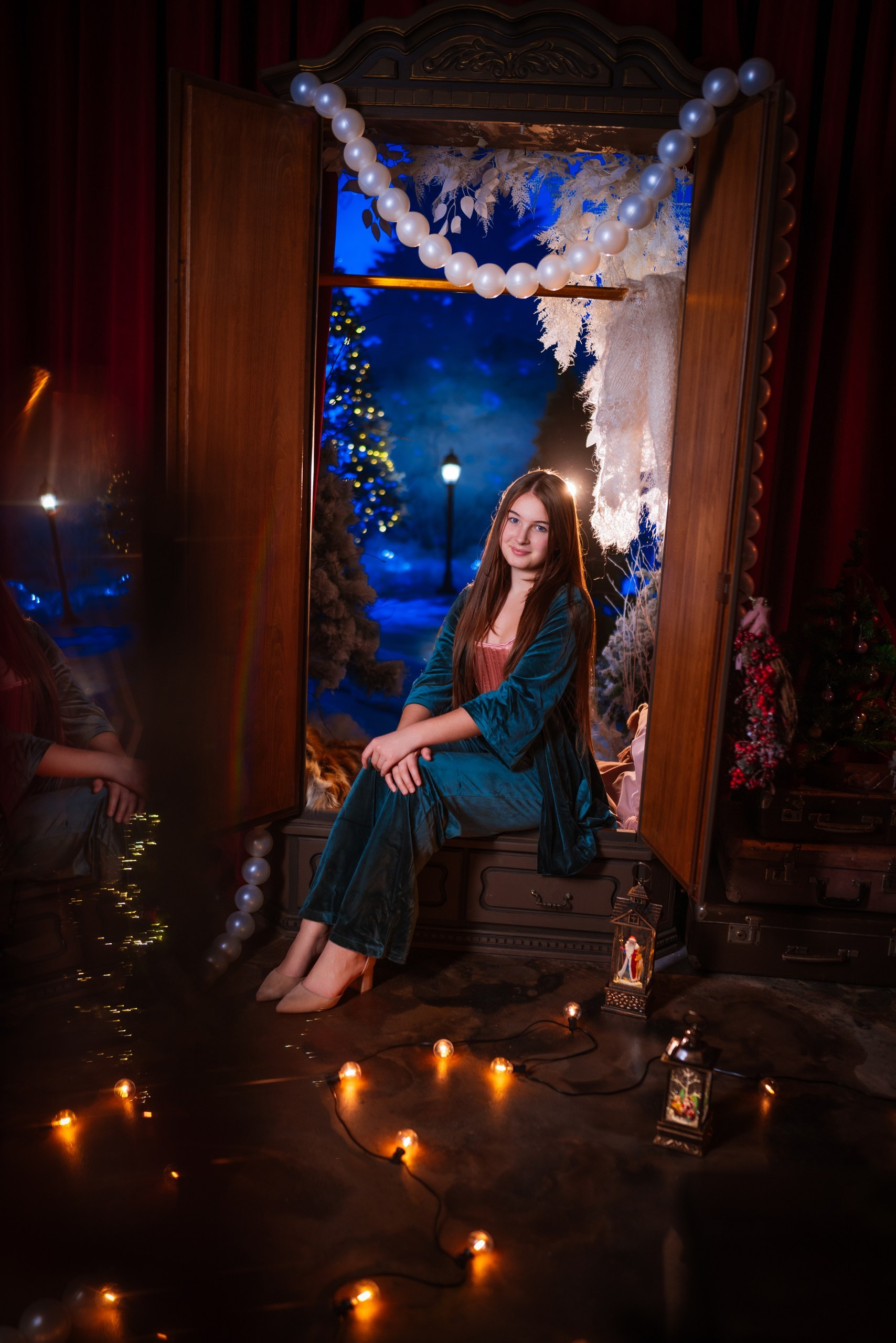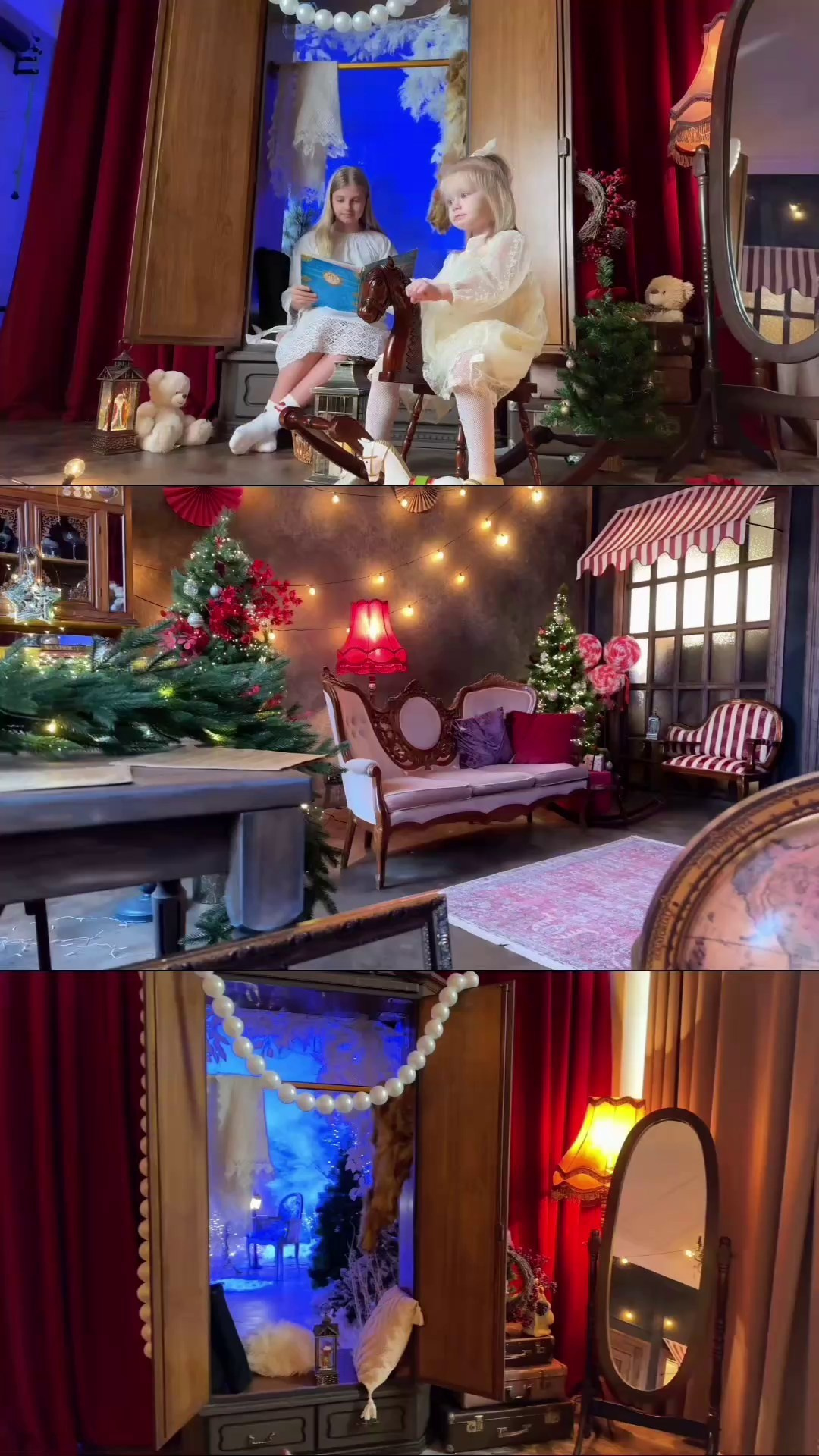 - Несколько локаций в одном зале (Волшебный шкаф «Нарния», снежный лес, арка, локация с дверьми и фальш-окнами, интерьерная зона со столом и диваном)