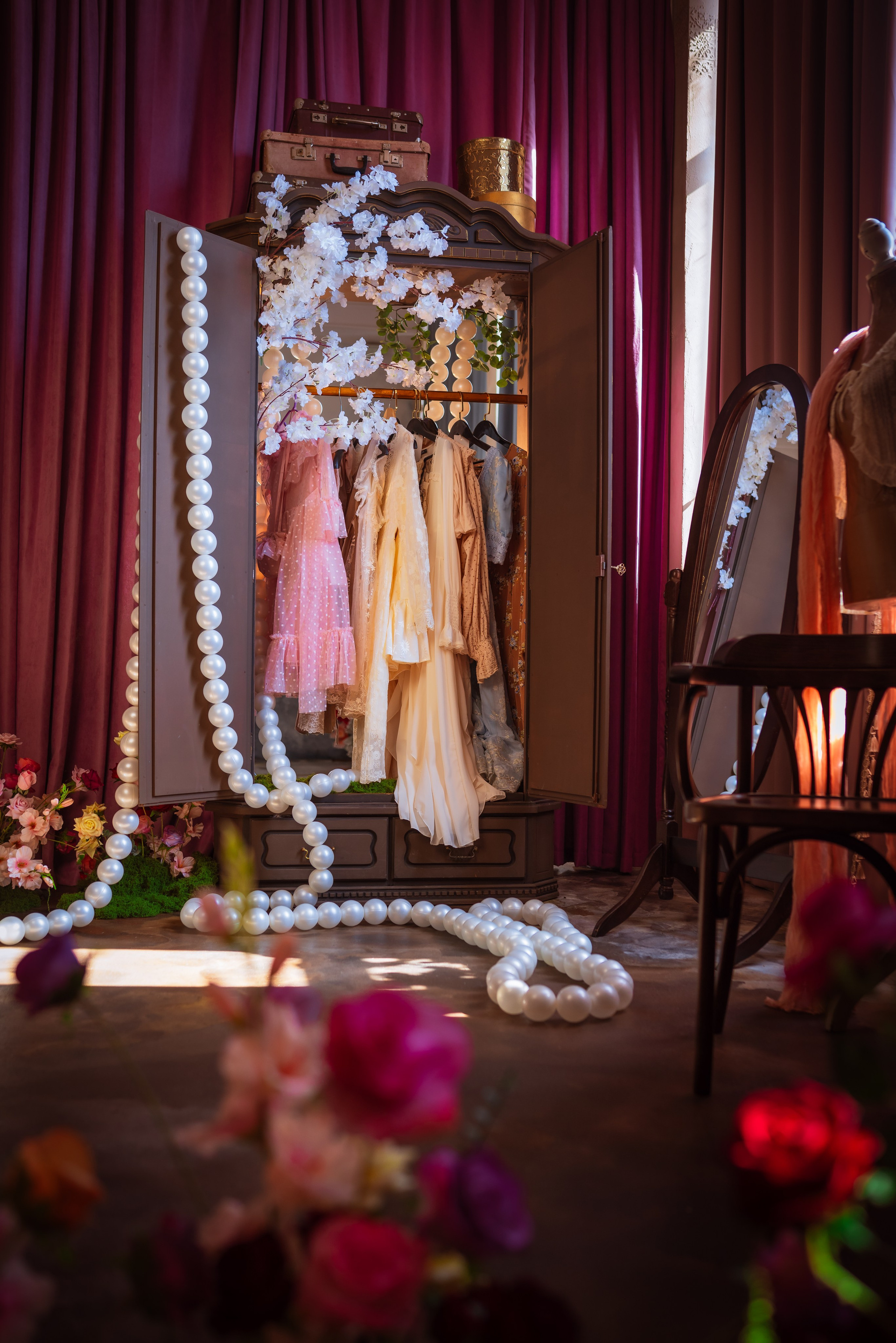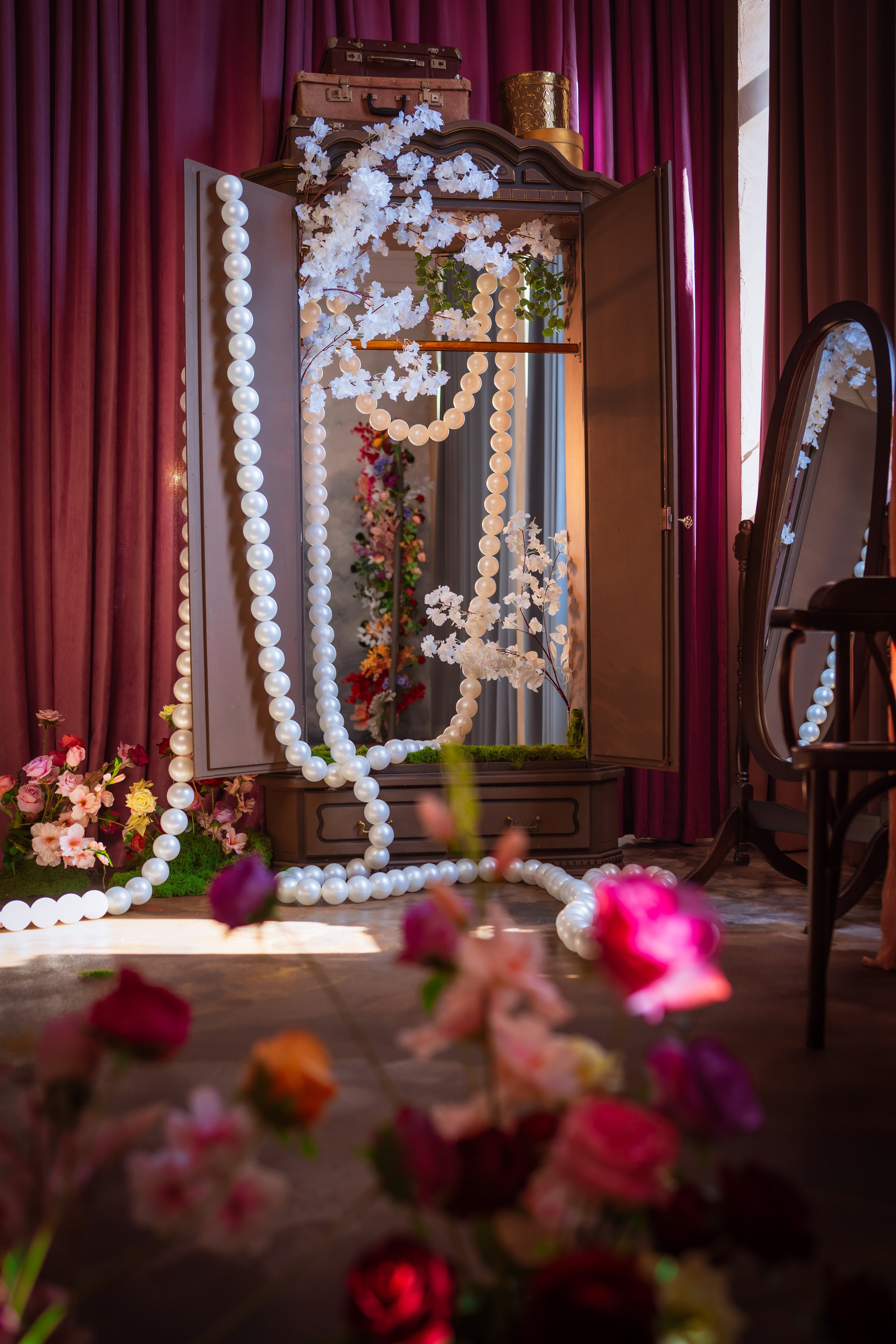 Эта локация находится с обратной стороны шкафа. В это зоне размещена банкетка, декоративные бусы, колонна и цветы.