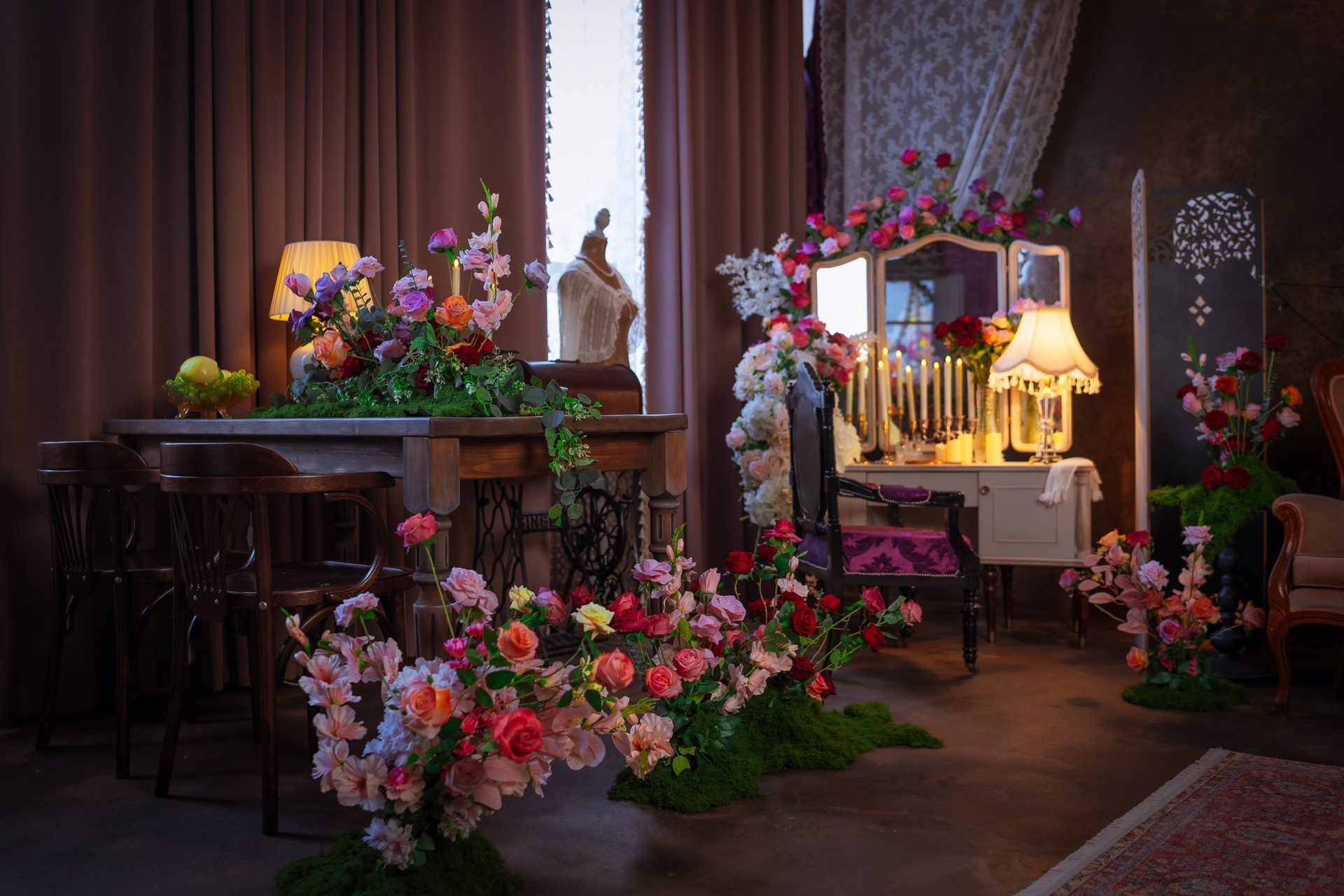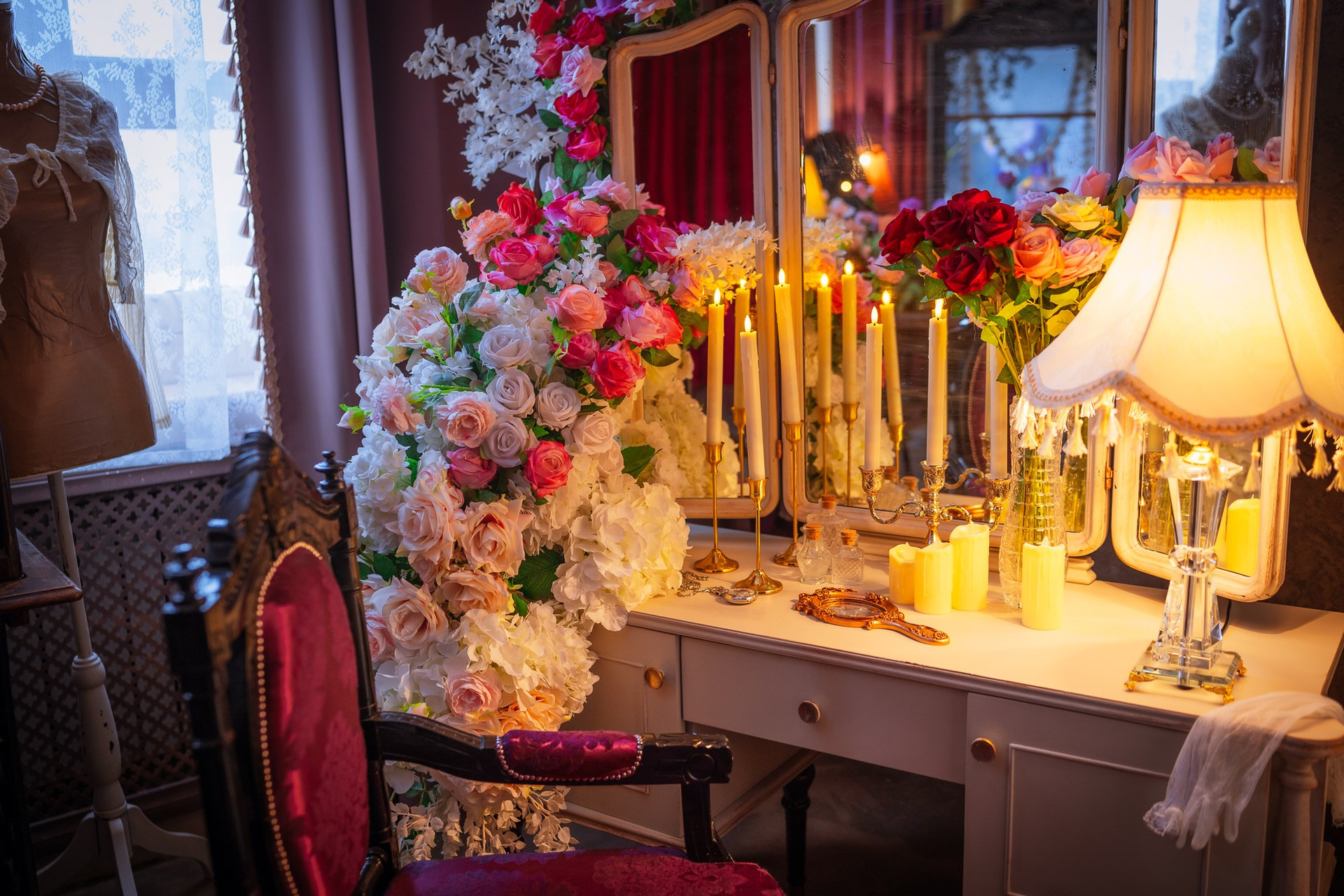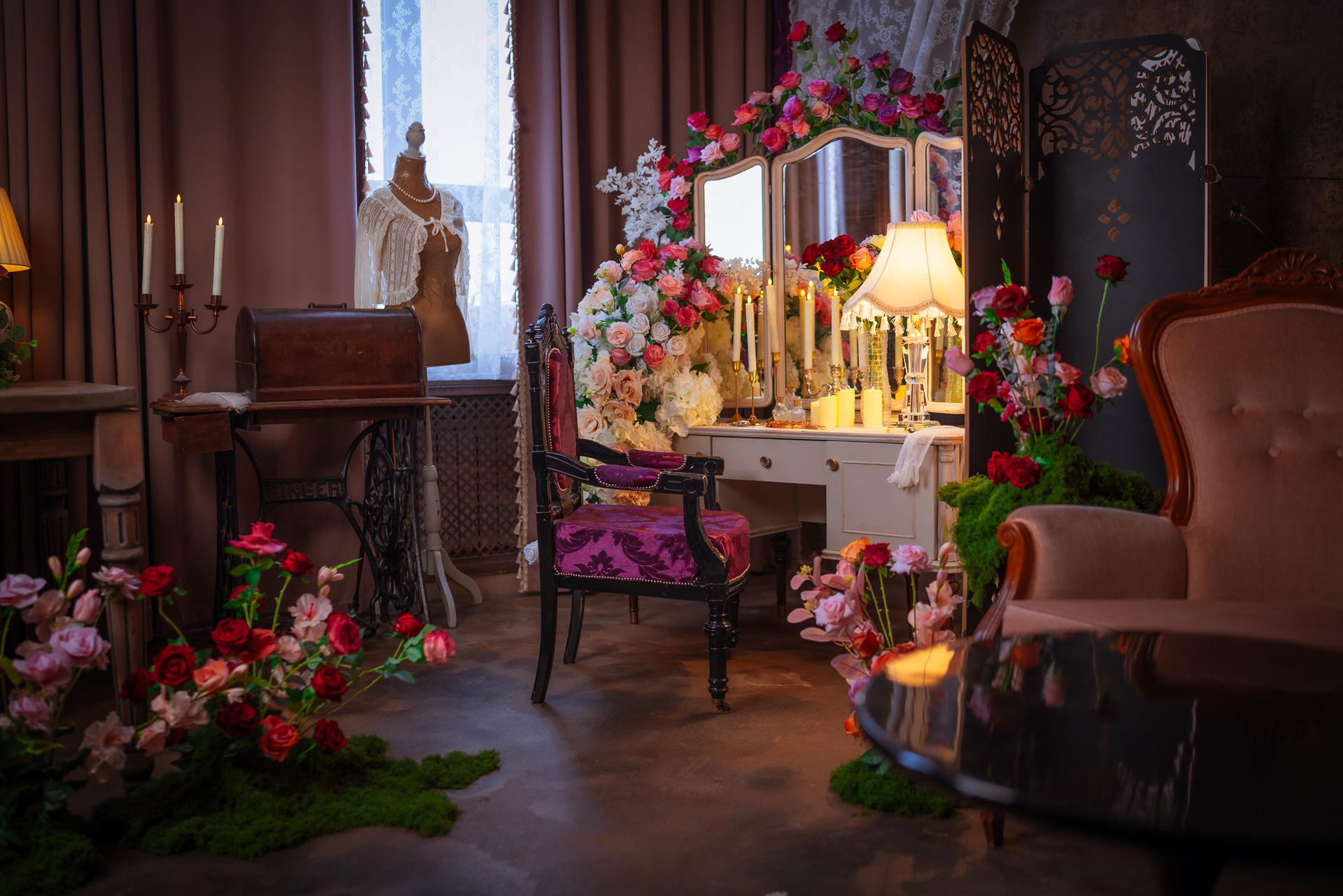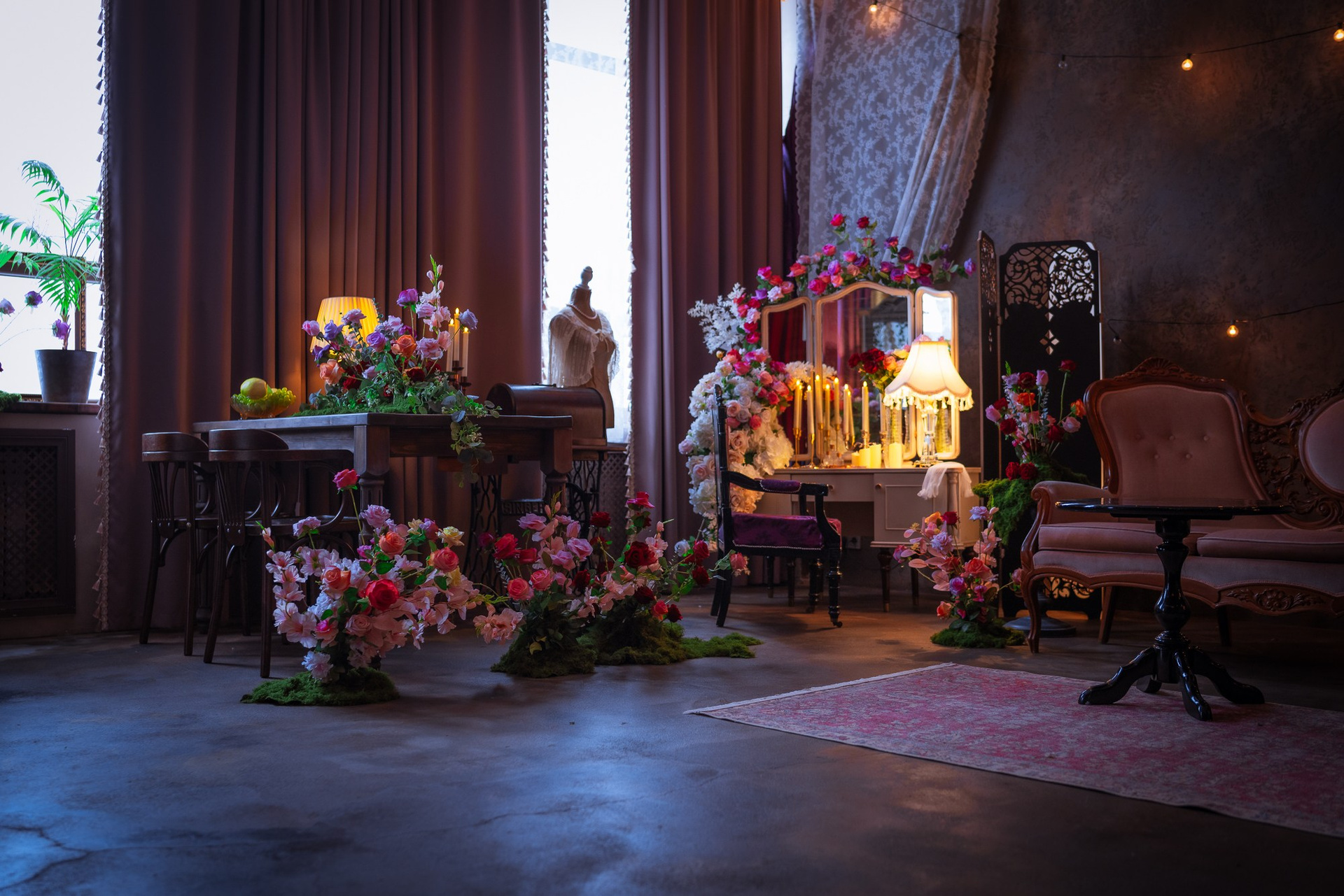 Туалетный столик, обеденная группа и диван. Локация украшена искусственными цветами, декоративным мхом и электронными свечами.