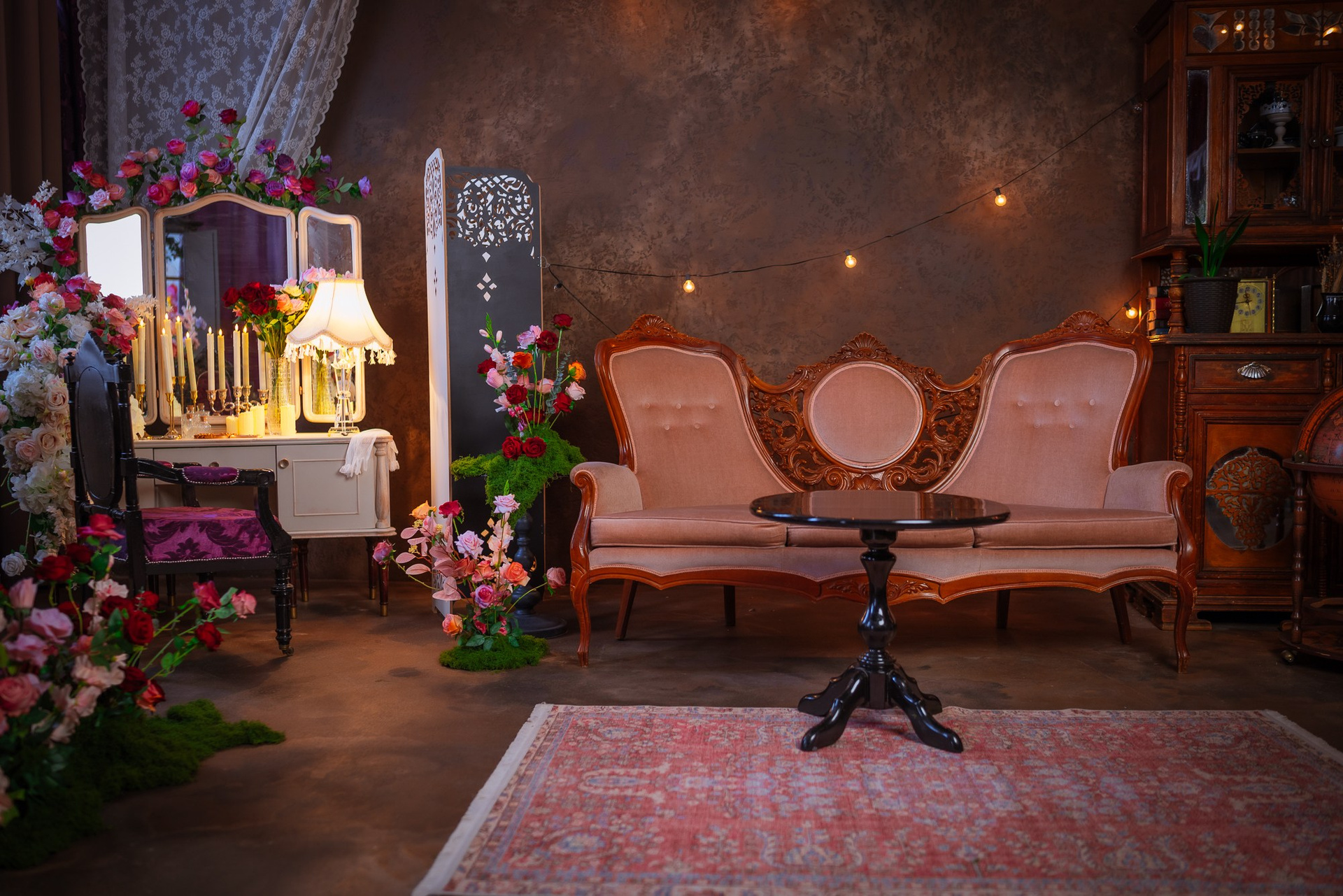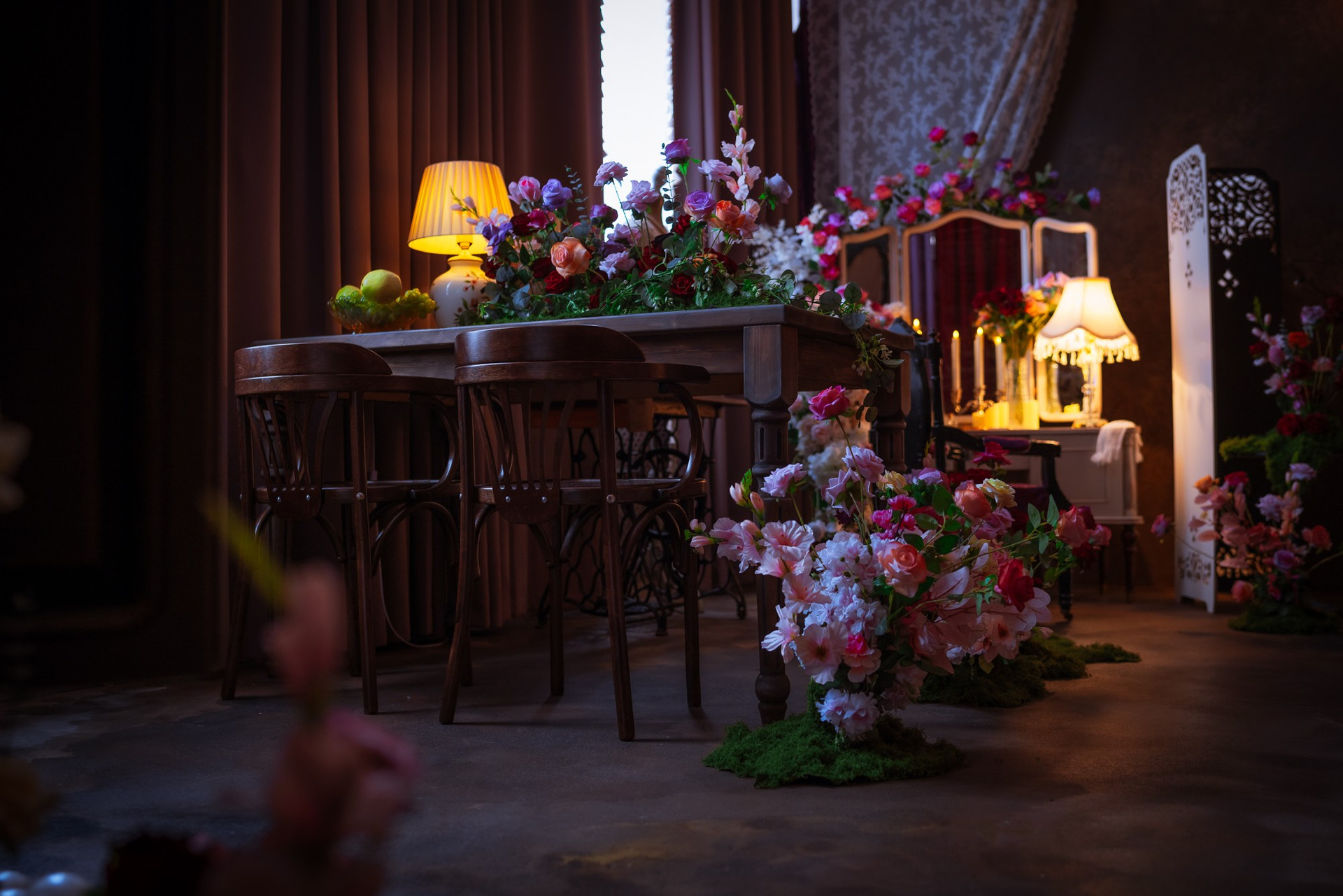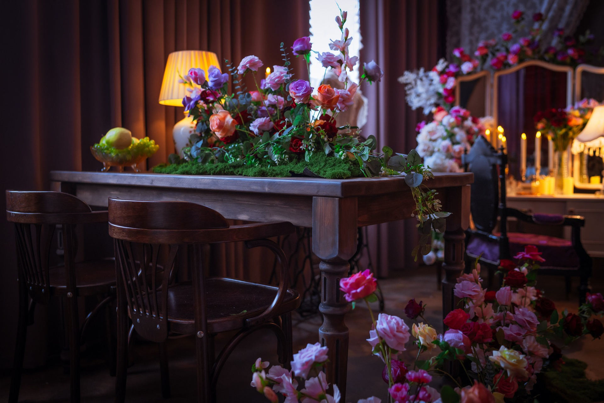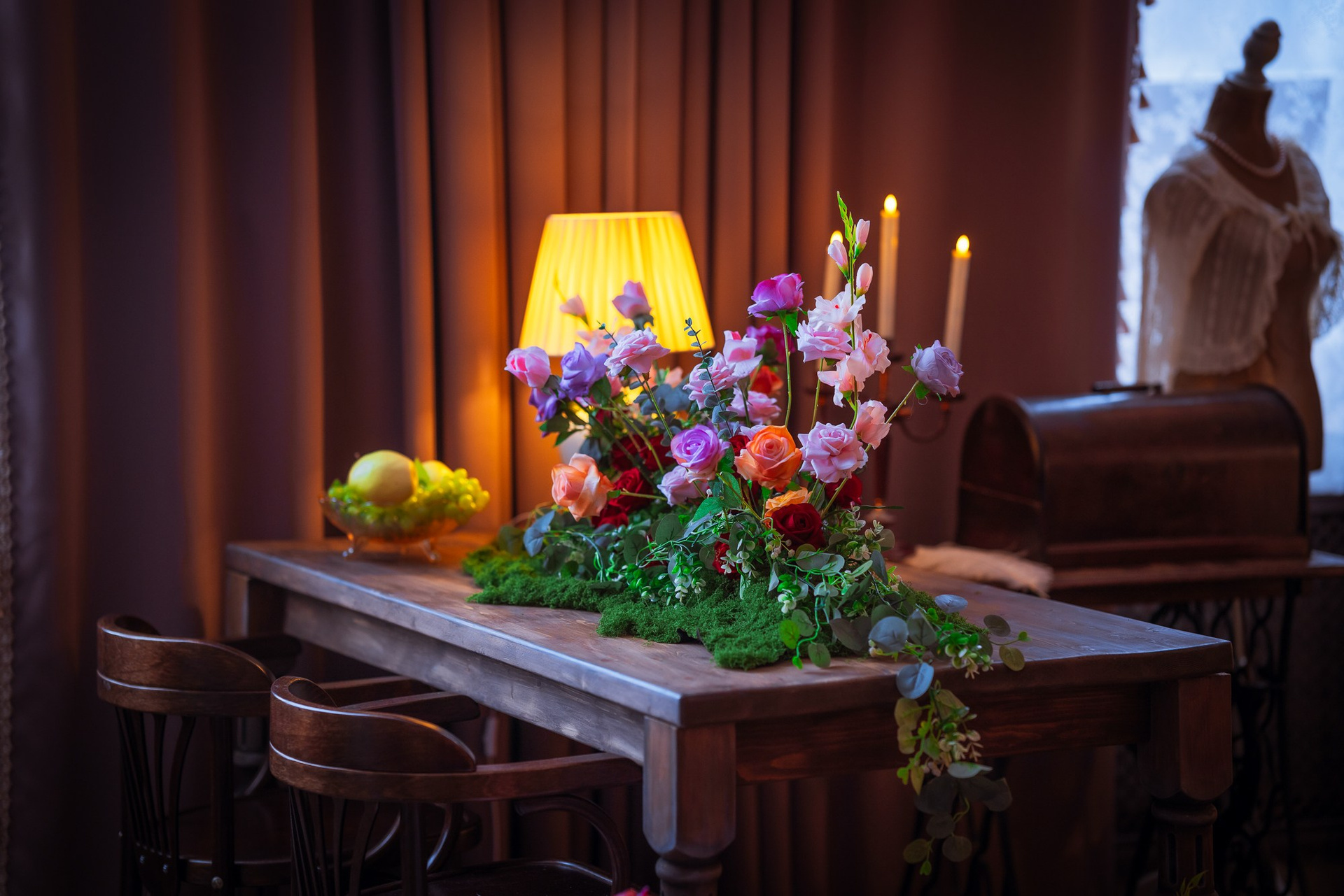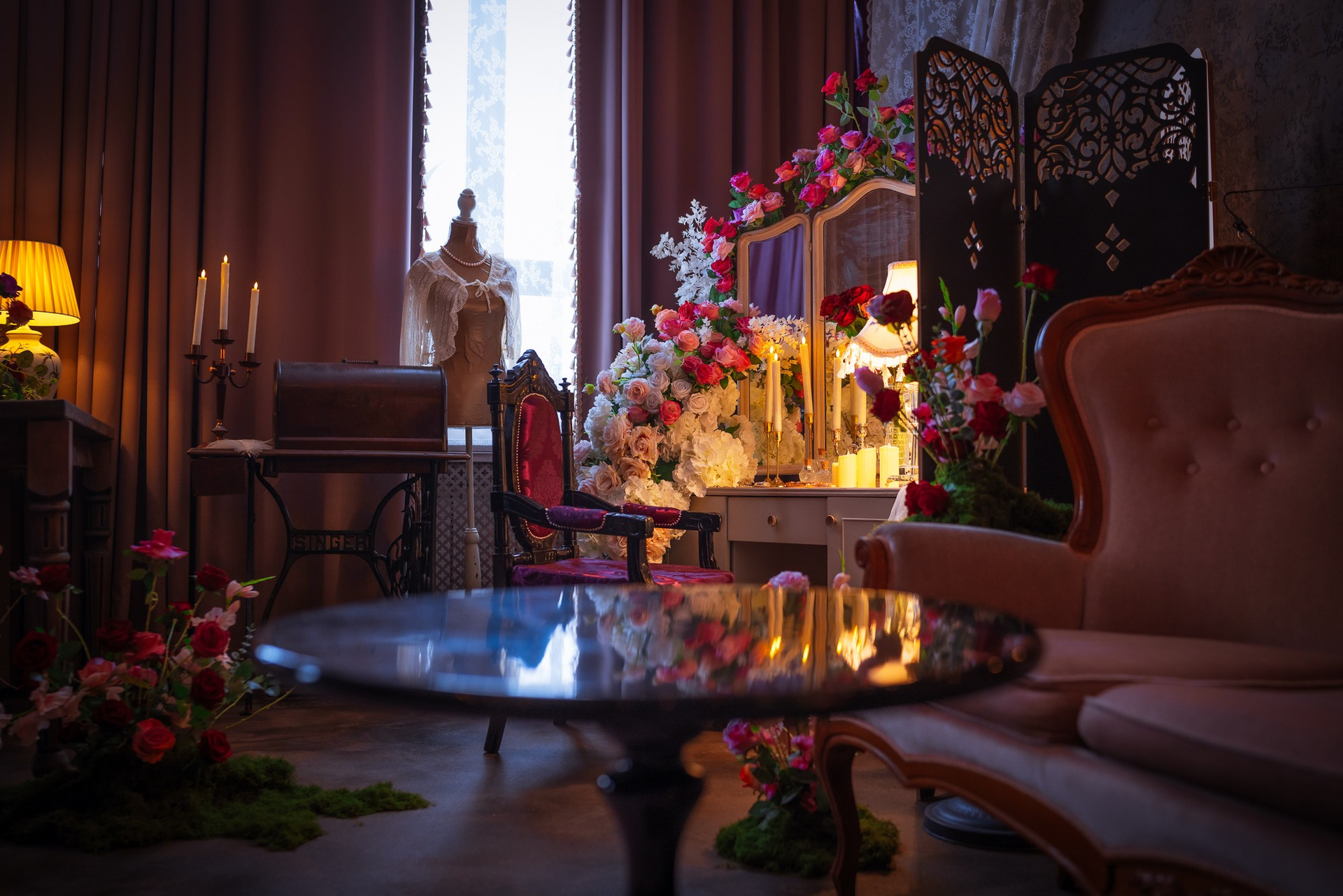 Туалетный столик, обеденная группа и диван. Локация украшена искусственными цветами, декоративным мхом и электронными свечами.