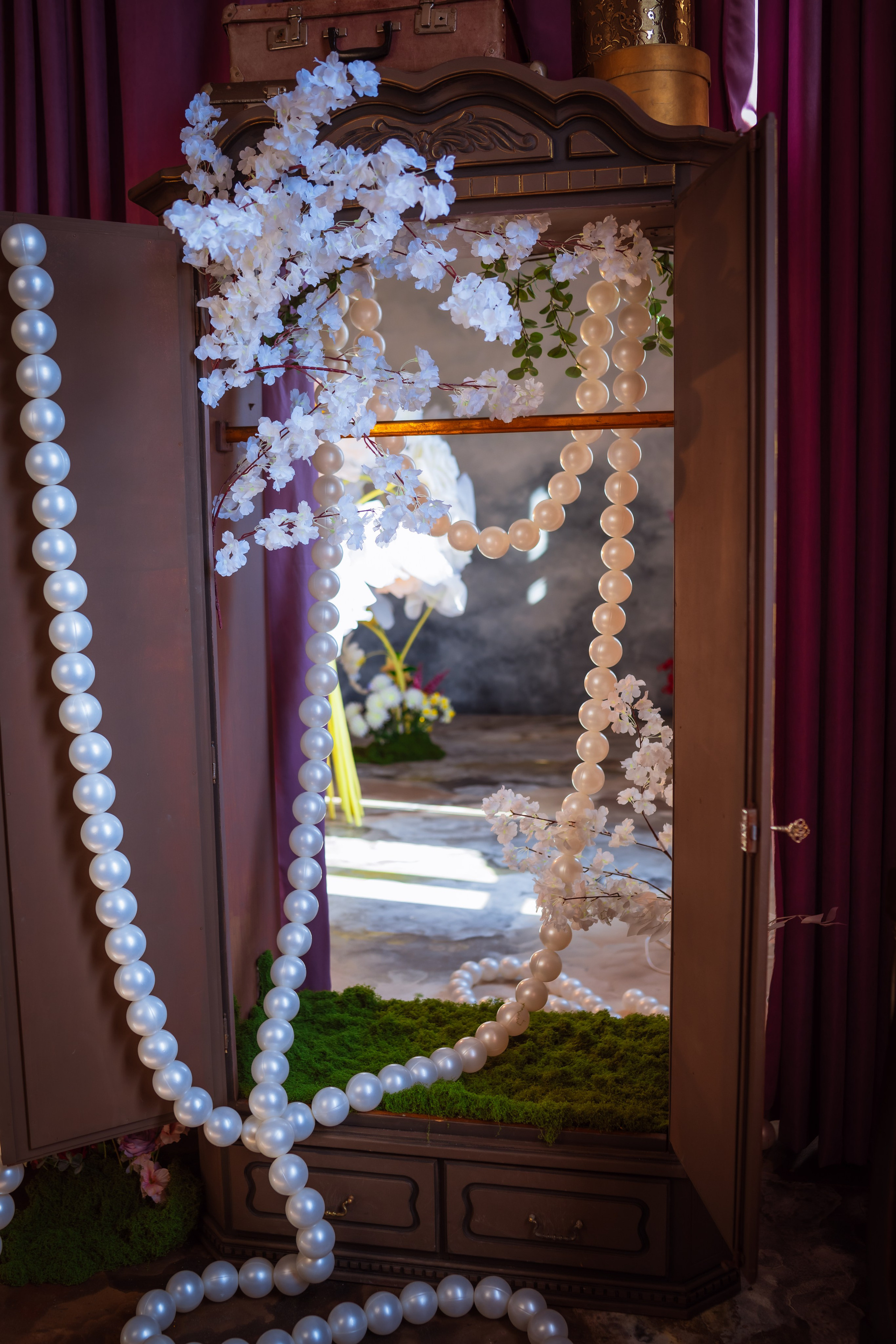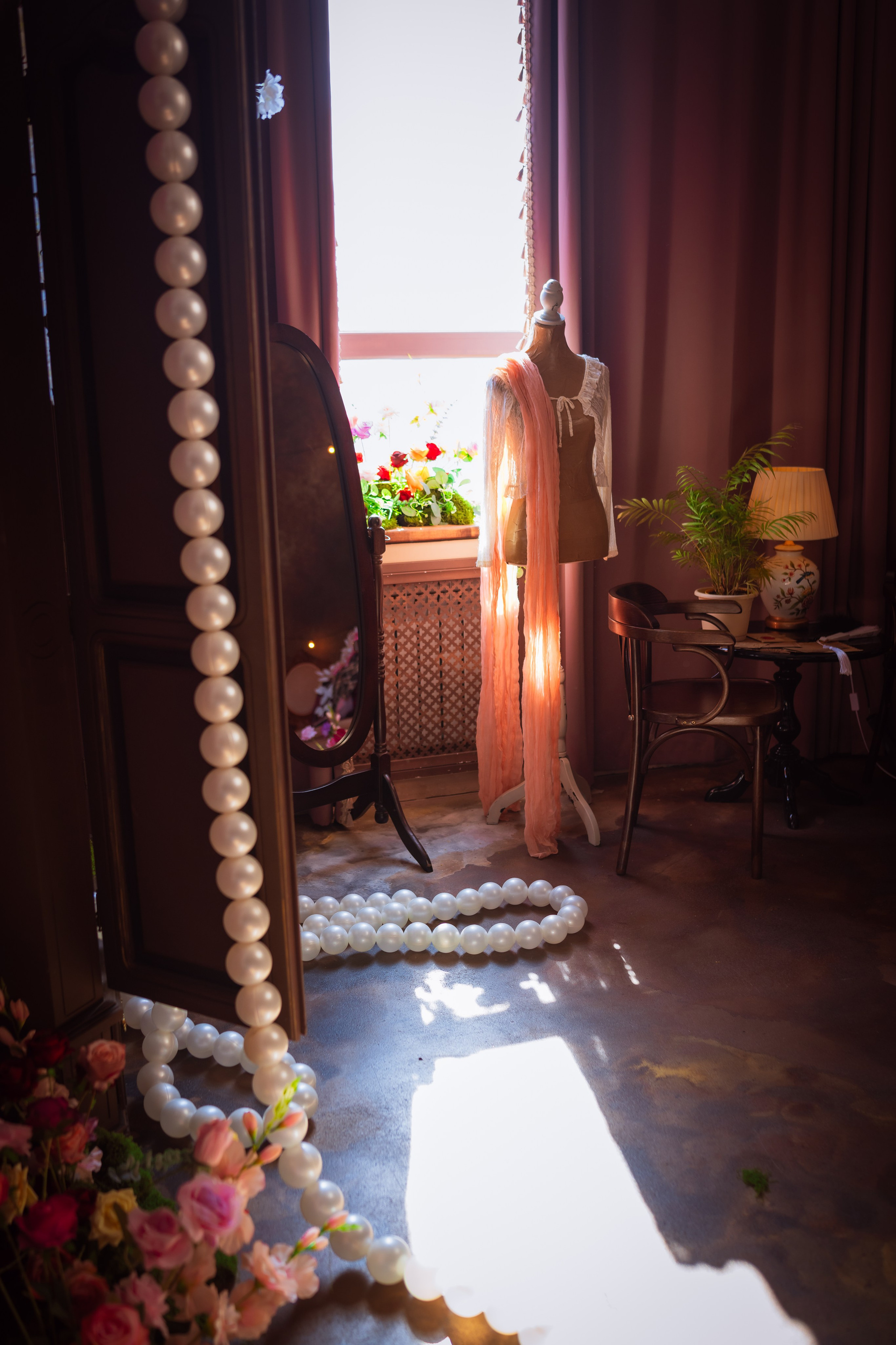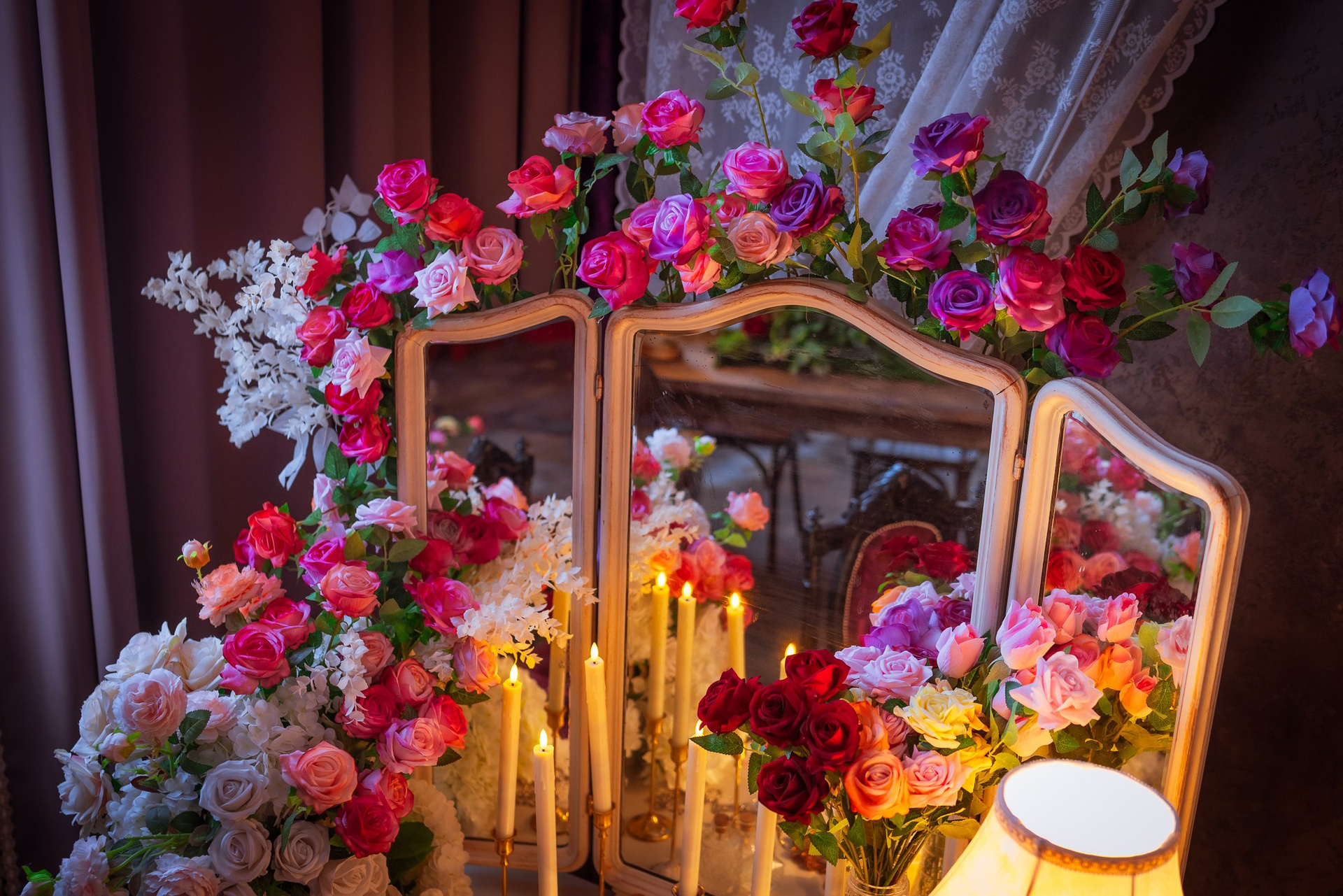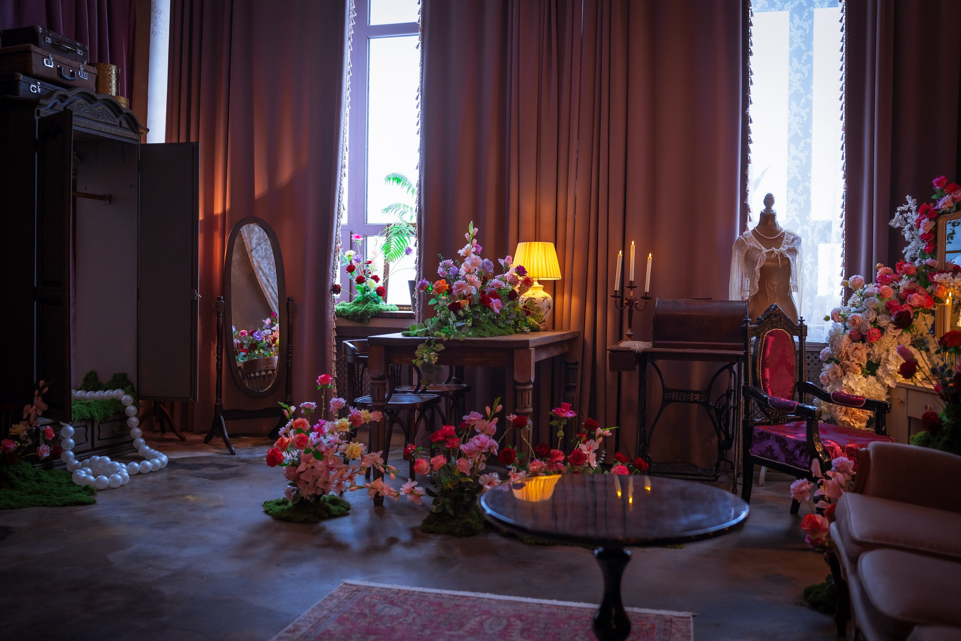 Туалетный столик, обеденная группа и диван. Локация украшена искусственными цветами, декоративным мхом и электронными свечами.