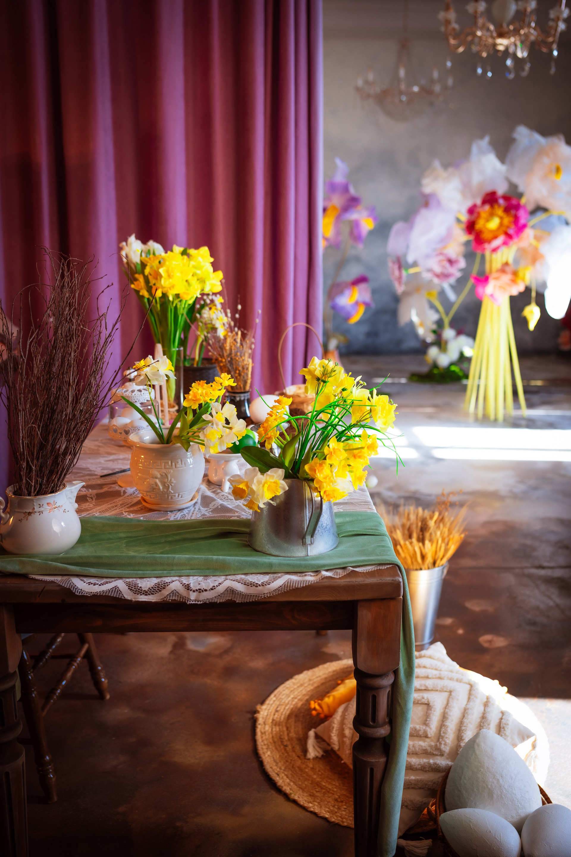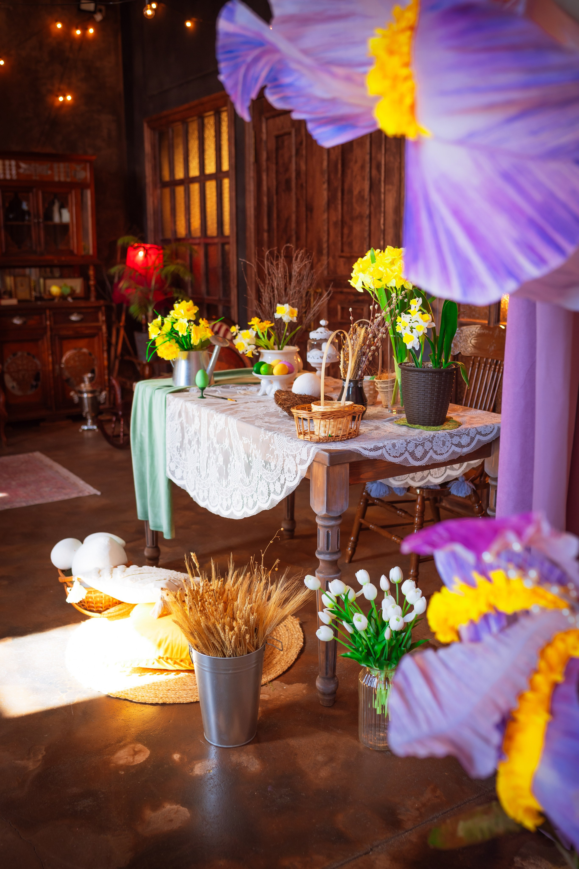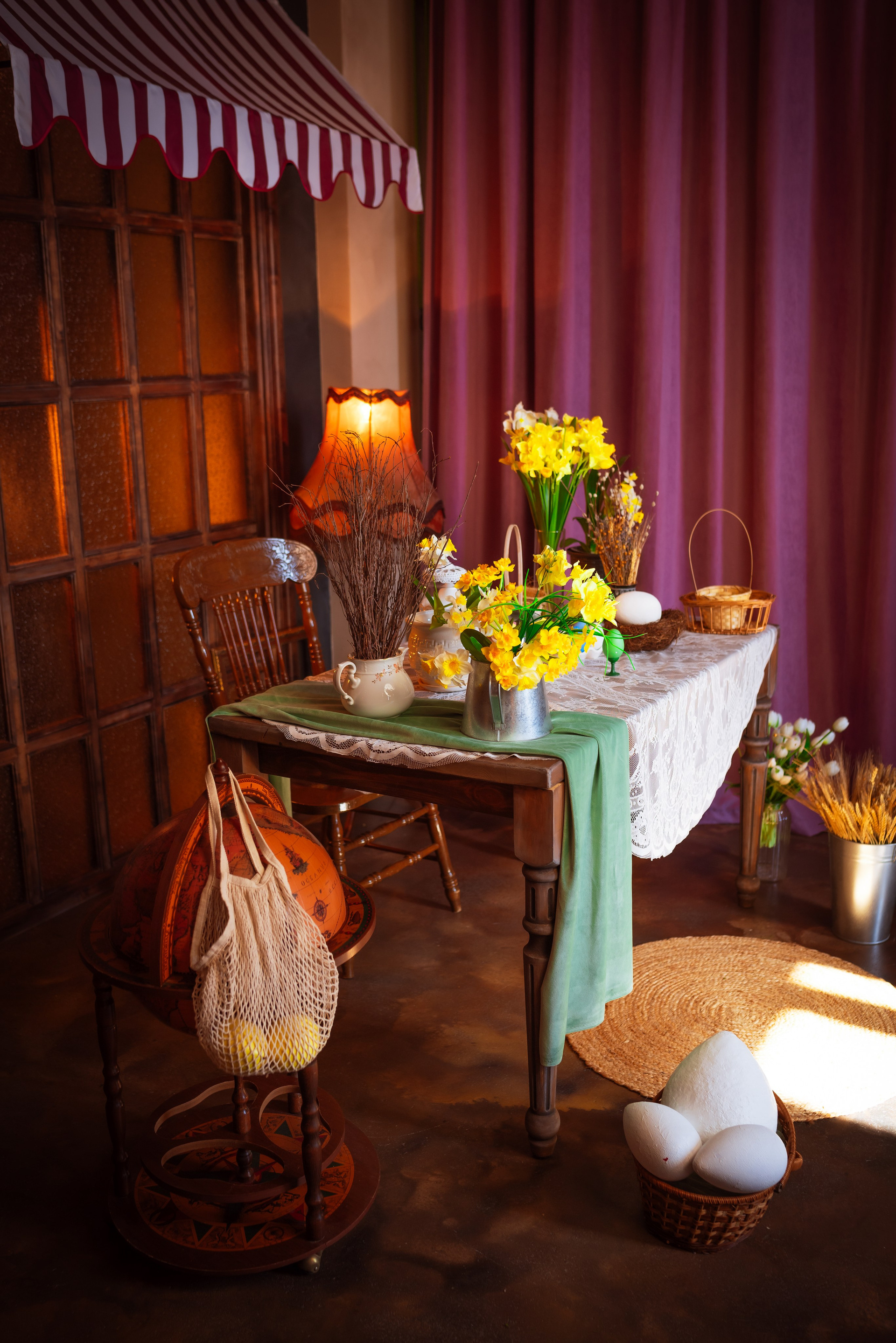 Временный праздничный декор. Стол с декором можно перемещать по студии. Элементы декора можно использовать в других зонах, например у шкафа.