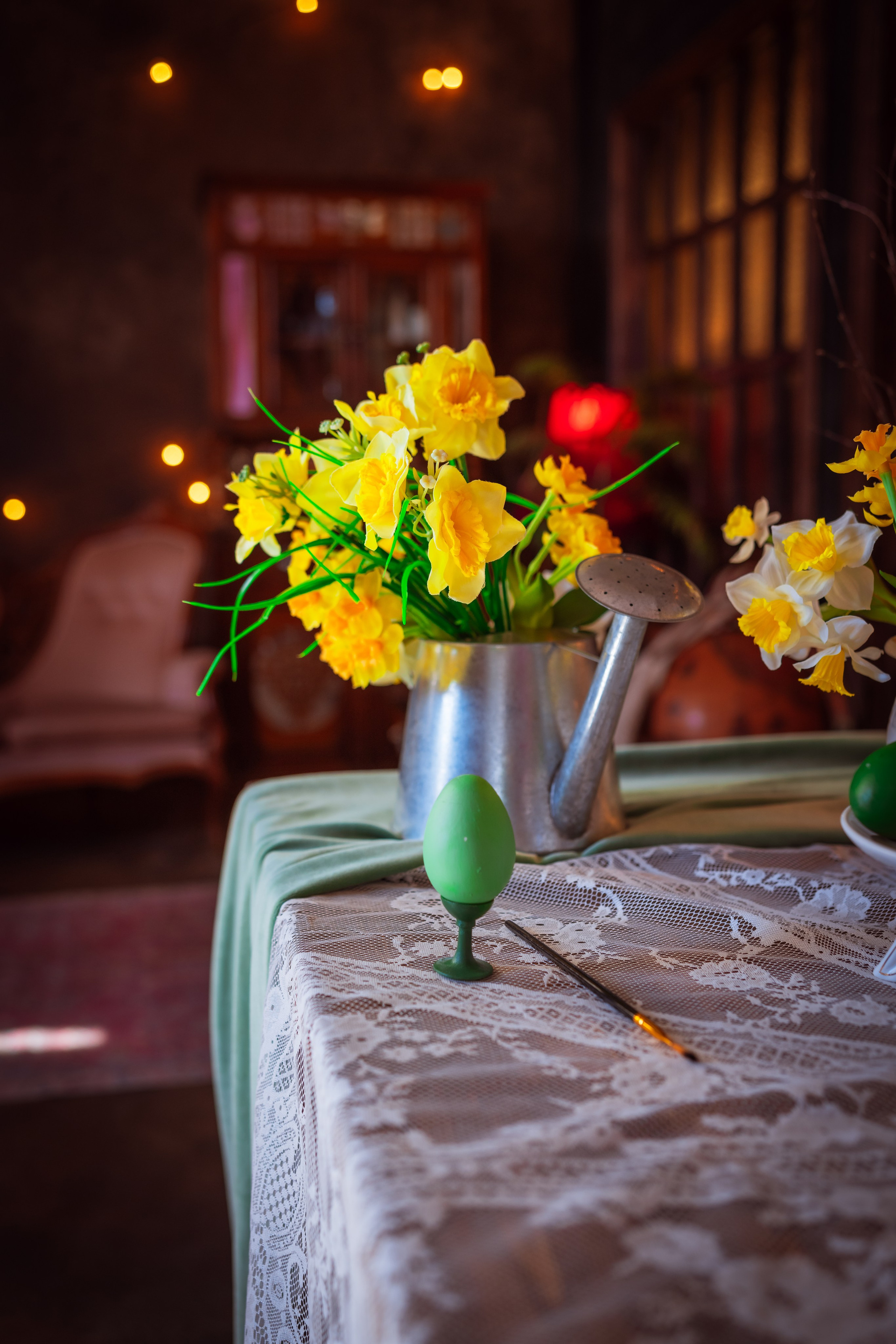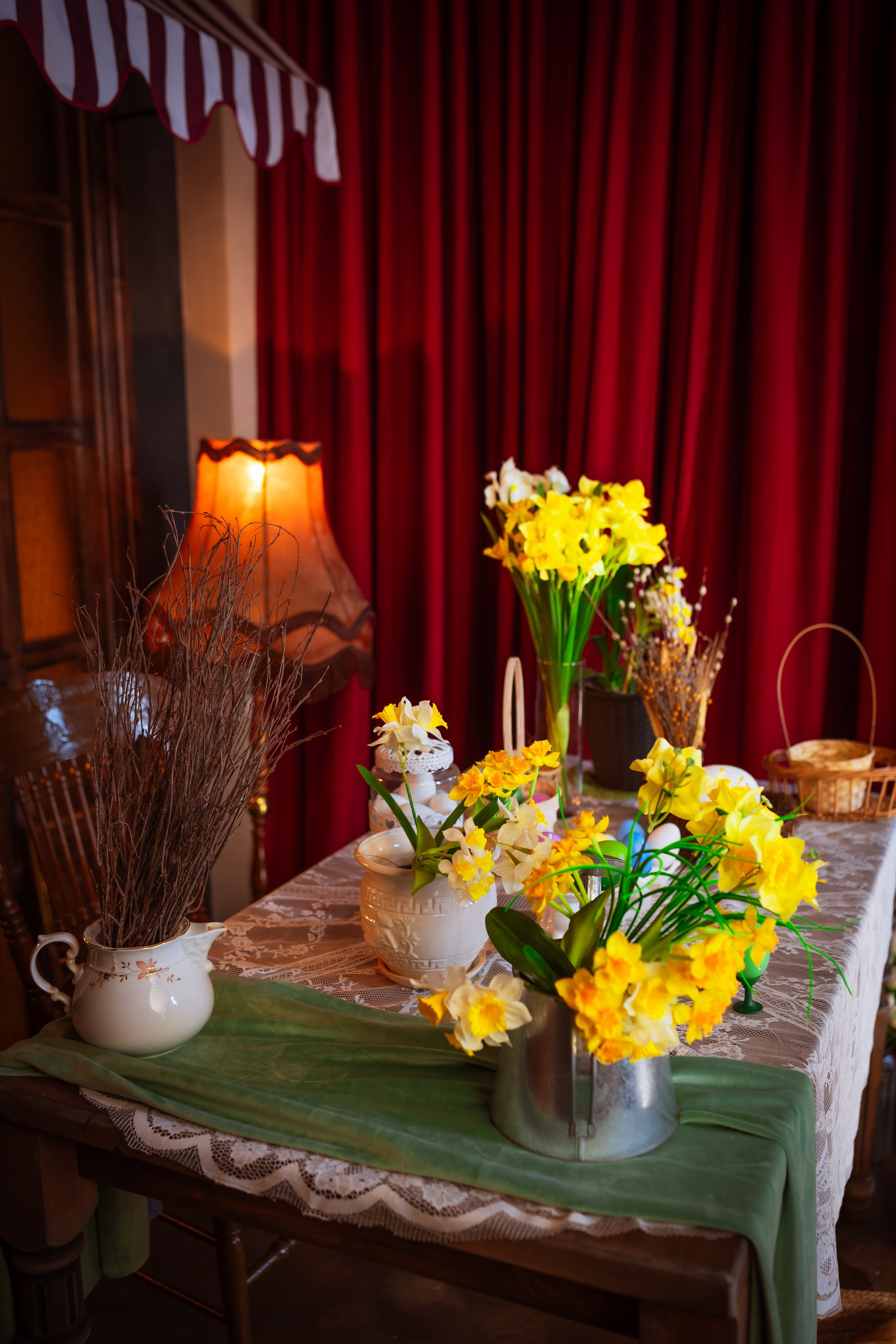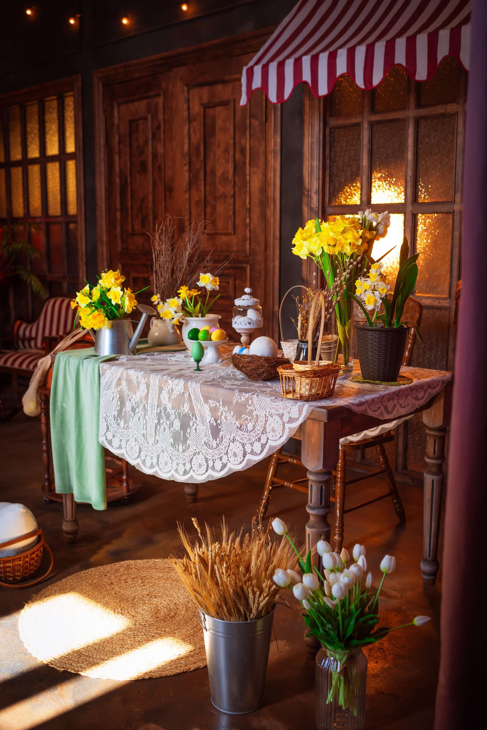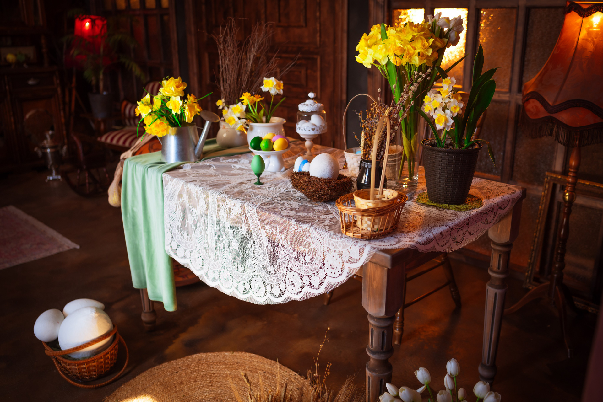 Временный праздничный декор. Стол с декором можно перемещать по студии. Элементы декора можно использовать в других зонах, например у шкафа.